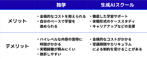 独学とスクールのメリット・デメリットを以下にまとめました。