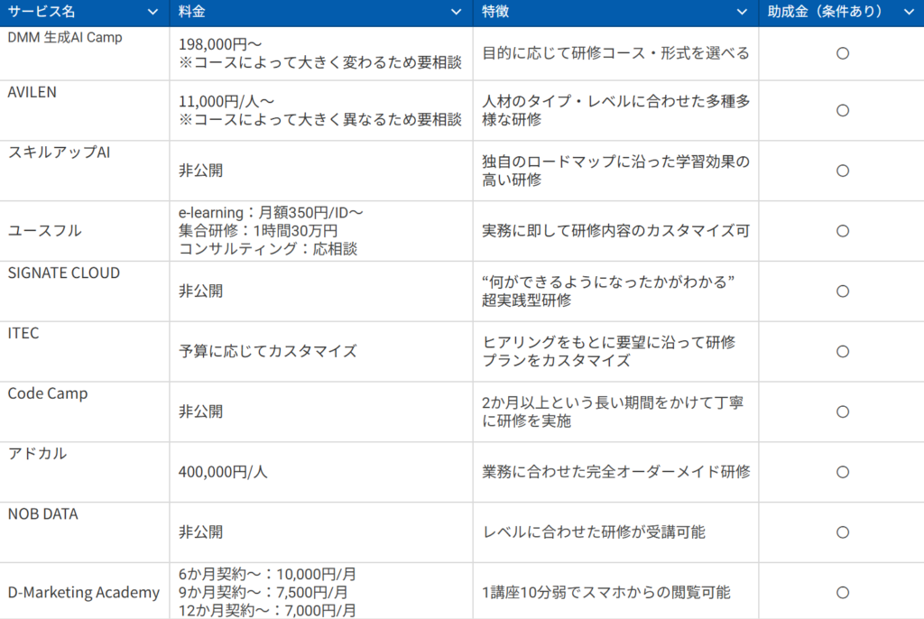 ここでは、AI研修の中でも法人向け生成AIの研修サービスを紹介します。