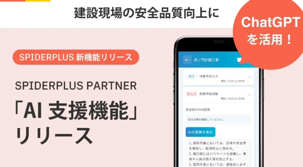 参考:PR TIMES「スパイダープラス、建設現場の安全品質向上にChatGPTを組み込み」