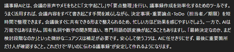 また生成AIは、語尾や言い回しのばらつきを抑えたり、読みづらい表現を自然な文章に書き換えたりすることが得意です。