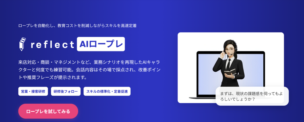 ReflectのAIロープレは、営業・接客・面談などの場面を想定したシナリオで、AI相手に何度でもロープレ練習ができる人材育成ツールです。