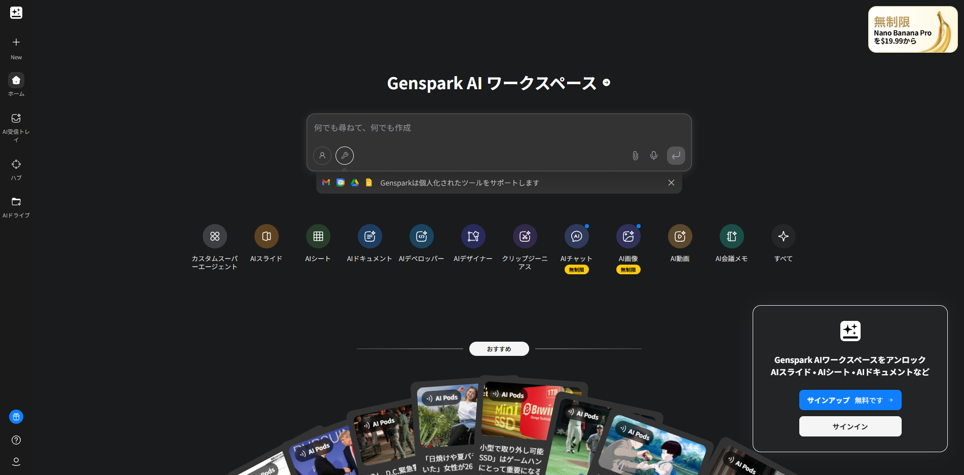 Gensparkは、最新の生成AI技術を結集した「AIエージェント」を備えた高機能プラットフォームです。最大の特徴は、ユーザーの指示を受けてAIが自律的に「思考・計画・実行」のプロセスを完結させる点にあります。